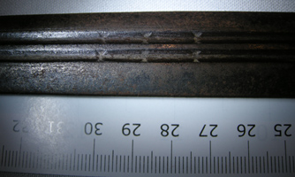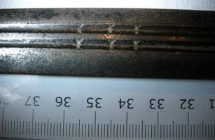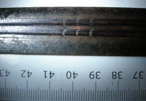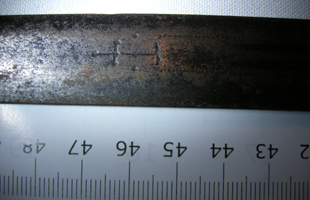 On each side of the blade in each of the two grooves three rows of three smith's marks can be found.